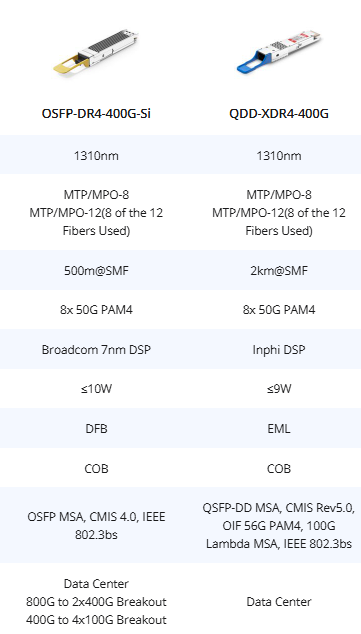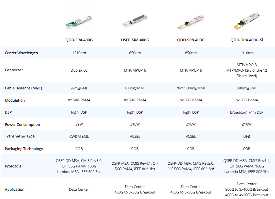 The 400GBASE-FR4 module, Duplex LC connector, up to 2km over parallel single-mode fiber. It is compliant to IEEE 802.3bs, 400GBASE-FR4 Spec of 100G Lambda MSA group, and 400GAUI-8/CEI-56G-VSR-PAM4 standards.
