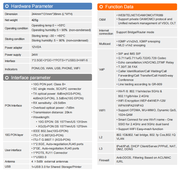 Leveraged the latest WiFi 6(AX3000) technology and equipped with IEEE 802.3av(10G-EPON)/ITU-T G.987(XG-PON)/ITU-T G.9807.1