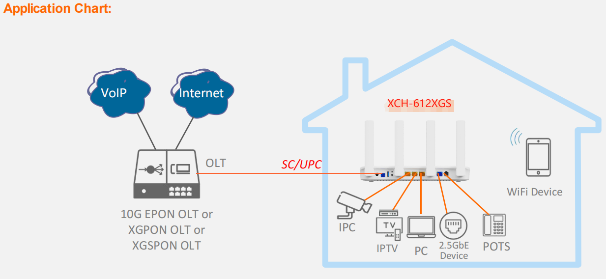 (XGS-PON) PON interface and IEEE802.11ax(WiFi 6) interface, VXCH-612XGS supports the full Triple Play of services enabling Data, Voice and Video services through Ethernet, Wi-Fi, FXS and USB standard interfaces, help Internet Service Providers to deliver internet service more than 2.5Gbps which is limited by GPON.