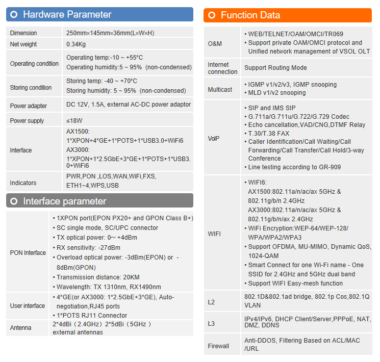 The ONT is based on high-performance chip solutions, supports XPON dual-mode technology (EPON and GPON), and also supports IEEE802.11b/g/n/ac/ax WiFi 6 technology and other Layer 2/Layer 3 functions, providing data service for carrier-grade FTTH applications. In addition, the ONT also supports the OAM/OMCI protocol, and we can configure or manage various services of the ONT on the VSOL OLT.